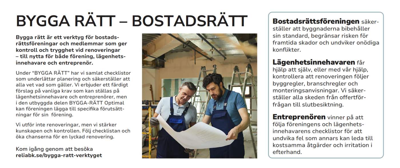 Bygga Rätt är ett stöd för bostadsrättsföreningar, bostadsrättsägare och hantverkare/entreprenörer inför bostadsrättshavarnas kommande renoveringsprojekt.